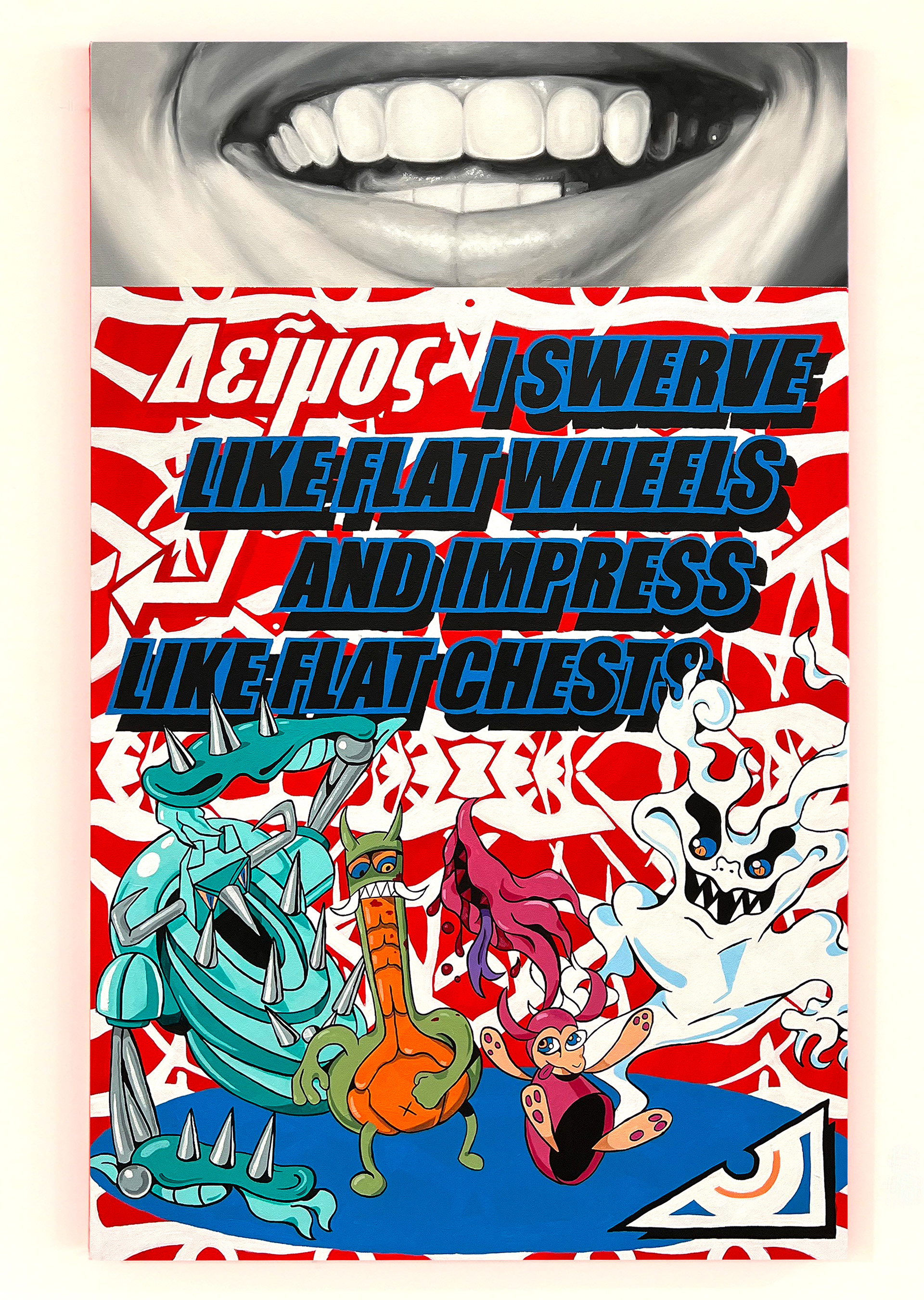 The partner painting in the diptych, “Deimos” is to be represent Eros, while the prior work, "Phobos", is to represent Thanatos. The phrase “I swerve like flat wheels and impress like flat chests” is a phrase ripe with inuendo, highlighting an intense self-deprecation, insinuating critical internal faults and inadequacy both romantically and sexually. The characters at the base of the painting perhaps represent a scattered psyche or are maybe harbingers of madness